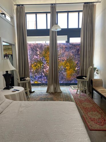 The La Di Da is an accommodation for two. A queen bed in the window filled room. Large shower. Outside covered patio with a golf cart sized garage door facing First street. And a large counter with a sink.